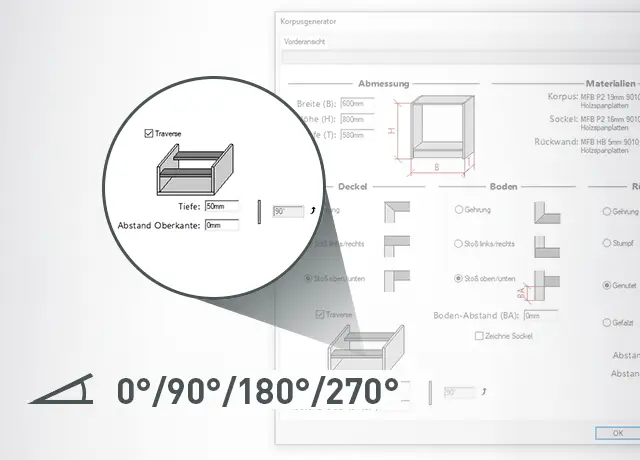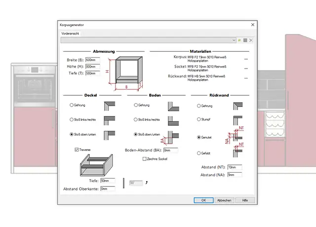 Der „Korpusgenerator“ zeichnet für Sie. Bestimmen Sie, wie der Korpus aussehen soll: Abmessungen, Material, Verbindungsvarianten und Sockel. Passen Sie alles individuell und einfach mit einem Klick an.